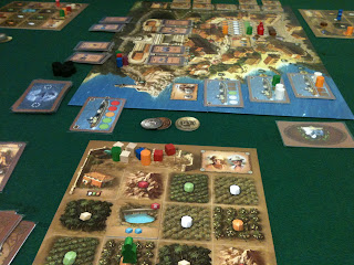 O mais legal desta partida foi que todo mundo pegou o “jeito” do jogo rapidamente e passaram a prestar atenção nas ações dos outros. Um jogador sempre atrapalhava o outro, ocupando os lugares livres das ações alternativas de cada carta ou construindo edifícios almejados pelos adversários.